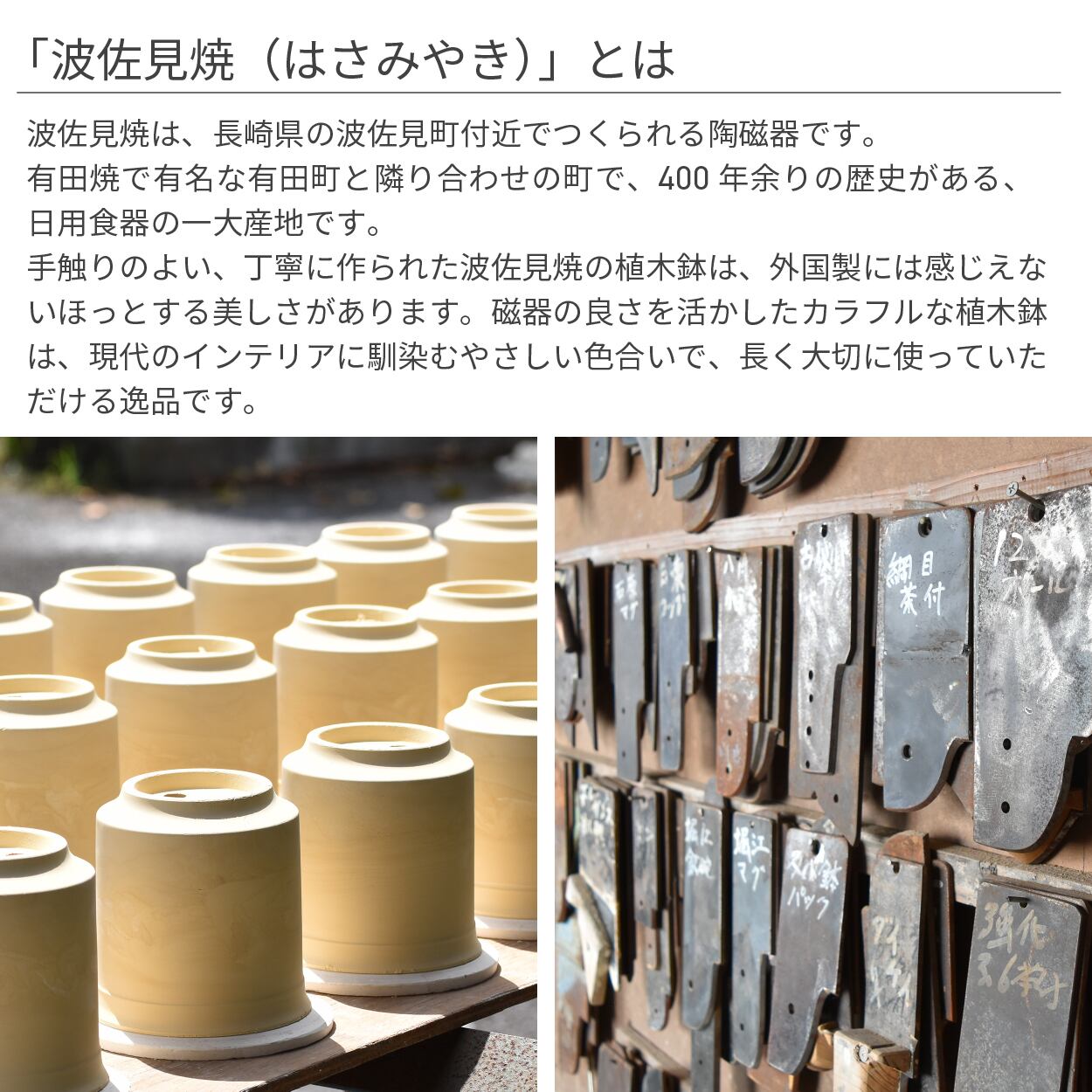 波佐見焼の植木鉢。熟練の職人が一工程ずつ検品をしながら仕上げた、美しい高品質の植木鉢です。国産にしかない丁寧な仕上がりをぜひ手に取って確かめてください。多少の風では転倒しないよう、しっかりと重みがありながらも、必要最低限に留めた適度な重さ。こ絶妙なさじ加減に日本製ならではの気の利き方を感じます。日本でも指折りの型職人が作った型で焼きあげた植木鉢は、光にあたると美しく反射し、形状の美しさ、品質の高さが際立ちます。愛着をもって長く使っていただける植木鉢です。